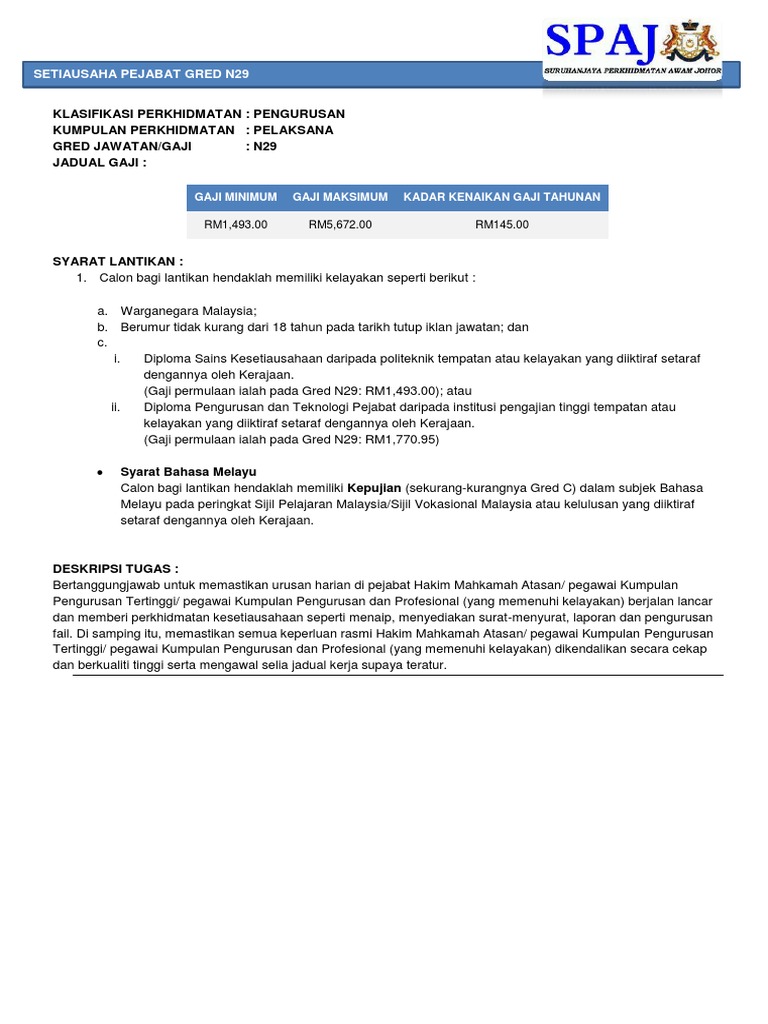 Gaji Kelayakan Tugas Setiausaha Pejabat Gred N29 Spa